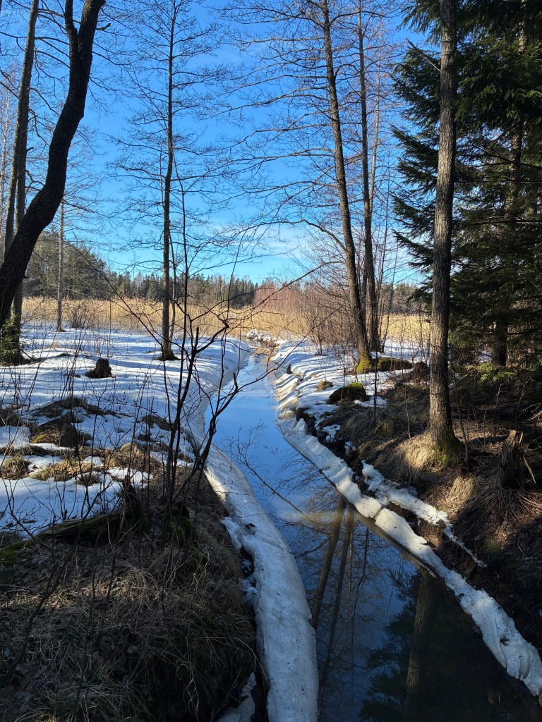 Reitillä on aika hiljaista, vain pikkulintuja ja muutama metsäkana. Parhaat tarkkailupaikat ovat parin avo-ojaylityksen jälkeen (kuva) sisälahden laitamilla, ennen edelleen laajentuvalle Googlelle johtavaa voimalinjaa. Läheisiltä pelloilta johdetut avo-ojat lannoittavat tehokkaasti Suomenlahden rantavesiä. Järviruoko valtaa alaa. Ympäristöhallinto hyväksyy asiain tilan hiljaisesti, siellä samassa ja yhteisessä veneessä tai avo-ojassa MTK:n kanssa. Entä ympäristöministeri? Purjehtija. Mutta kertooko sukunimi kenties jotain?